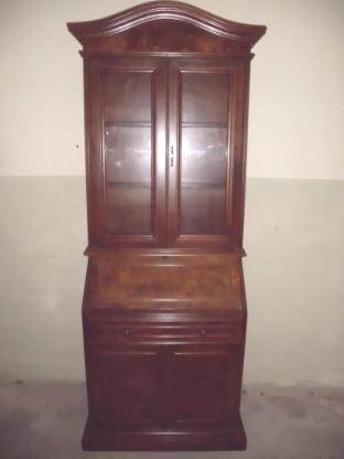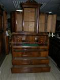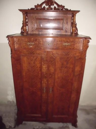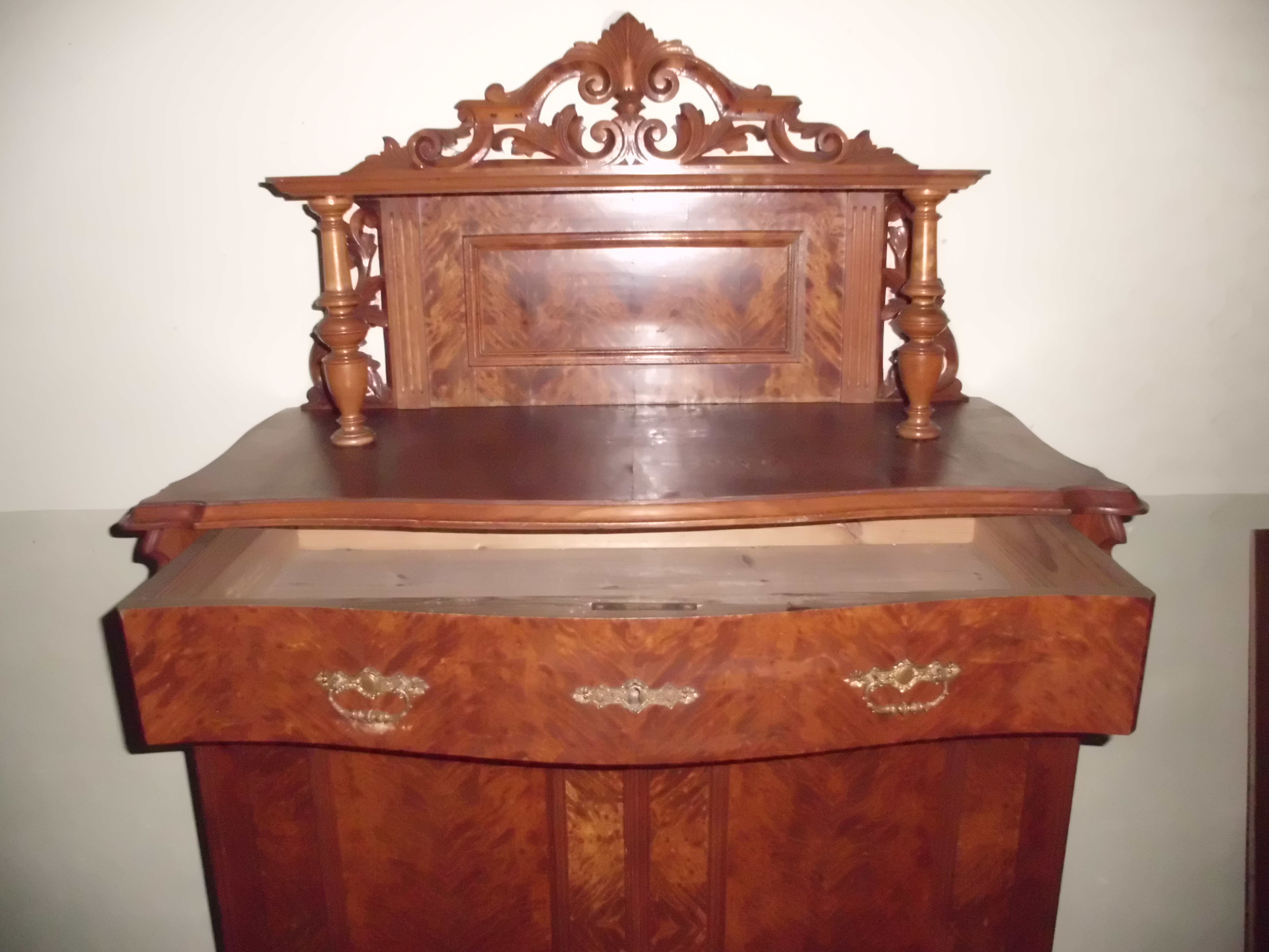 Ein außergewöhnliches Möbel, in einem für seinem Alter, guten bis sehr guten Zustand.Das Oberteil hat 3 geschwungene Türen mit je einem Einlegeboden. Es hat ein in 2 Voluten auslaufendes Dach / Bekrönung, sowie 2 Vollsäulen zwischen den Türen. Das Unterteil besteht aus 3 großen Schüben und einem darüber liegenden Auszug mit Schreibfläche, welche hochgeklappt werden kann. Links und rechts neben der Schreibfläche befinden sich auch noch 2 Schübe. Im Innenleben sind 13 kleinere Schübe und 1 Tür. Alle originalen Schlösser und Schlüssel vorhanden und funktionsfähig,bis auf den Schlüssel für die kleine Tür im Inneren. Komplett furniert in Nuss bzw Wurzel-Nuss.