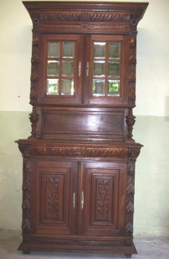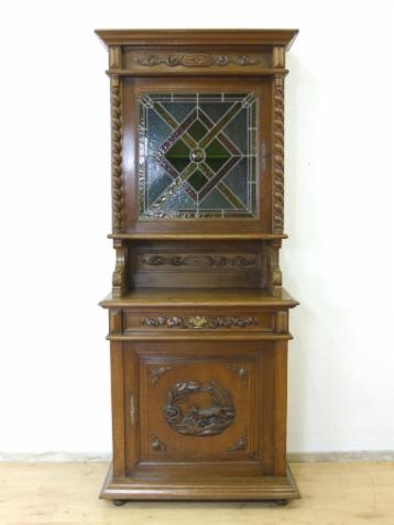 Oberteil mit fantastischer Bleiverglasung. Zwei kleine aber unauffällige Sprünge im Glas. Zwei seitliche Säulen in Korkenzieher-Form, Das Unterteil ist mit herrlicher Schnitzerei versehen. Die Sclösser funktionieren problemlos. Bis auf die Handhabe am Schubfach ist alles original.