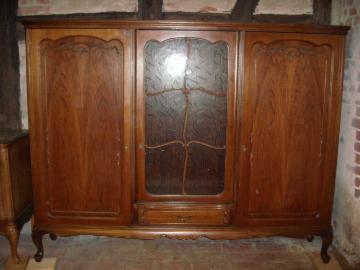 Der Schrank hat im oberen Teil Facettenspiegel. Es sind sehr viele Verzierungen bzw.Schnitzereien vorhanden. Als Holz wurde Nussbaum verwendet.